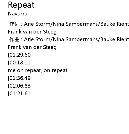 | [00:01.000] | 作曲 : Arie Storm/Nina Sampermans/Bauke Rients Top/Youp Ronald Frank van der Steeg |