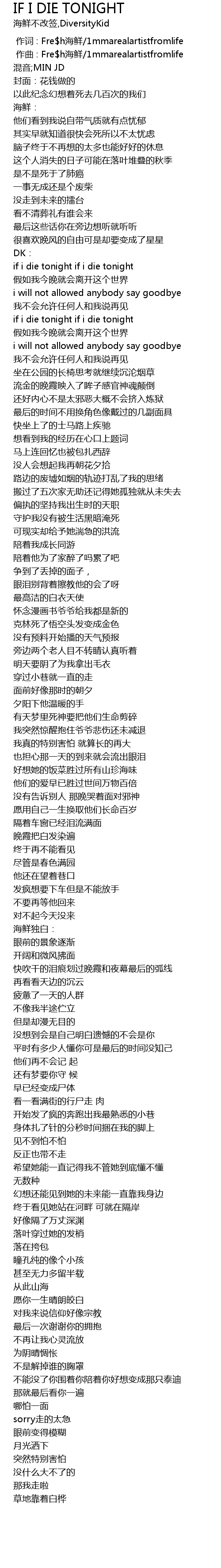 | [00:42.462] | jiǎ rú wǒ jīn wǎn jiù huì lí kāi zhè gè shì jiè |
