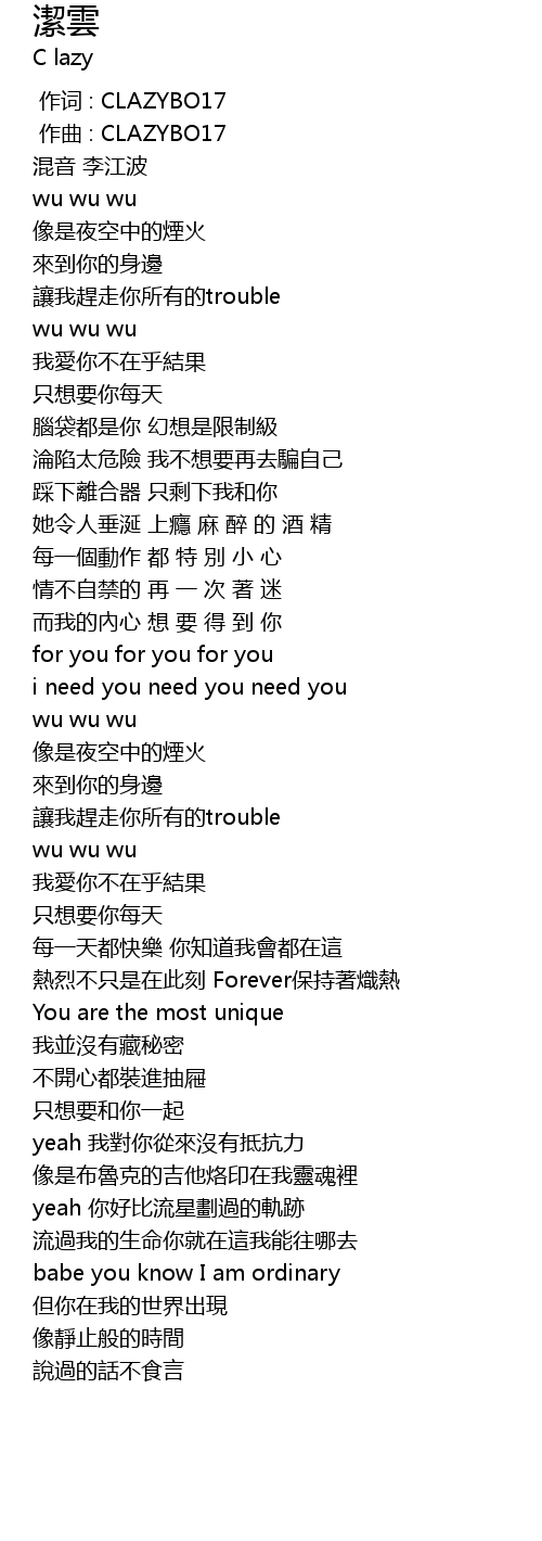 | [00:00.000] | 作词 : CLAZYBO17 |