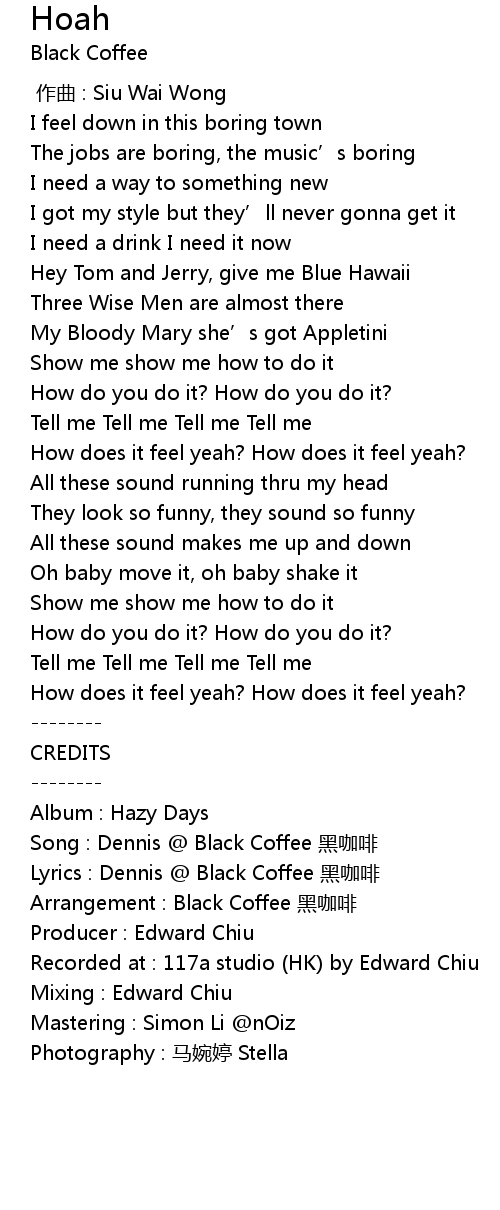 | [04:12.443] | Arrangement : Black Coffee hēi kā fēi |