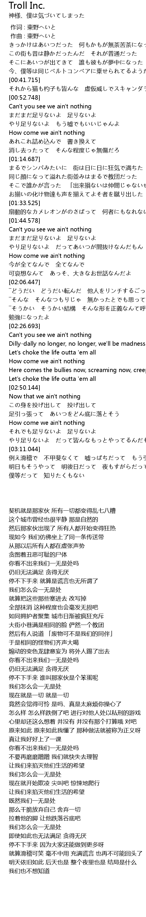 | [02:43.661] | Here comes the bullies now, screaming now, creepy crawling |