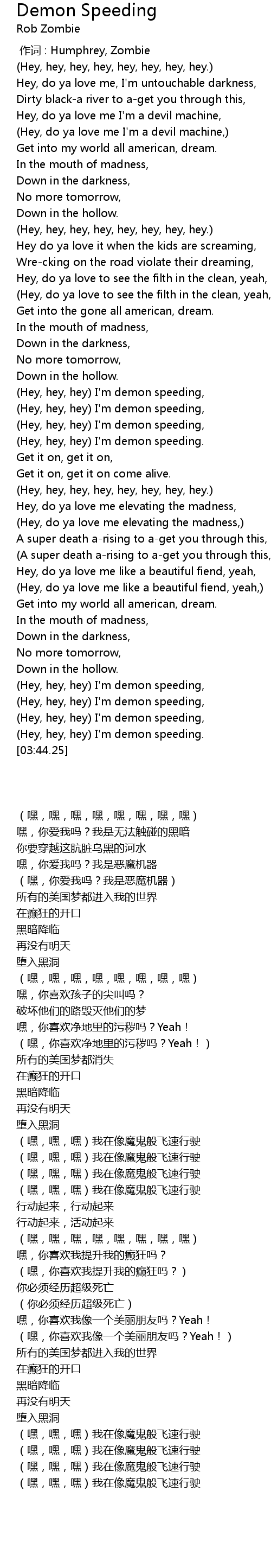 | [03:35.66] | Hey, hey, hey I' m demon speeding. |