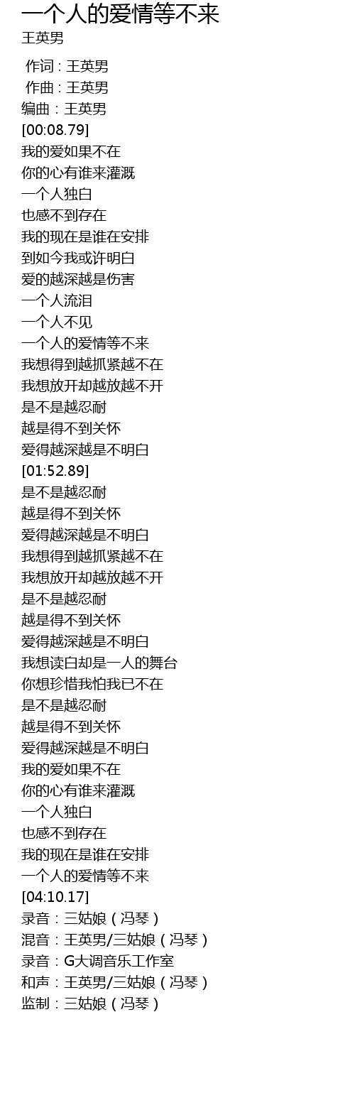 | [01:13.03] | yí ge rén de ài qíng děng bù lái |