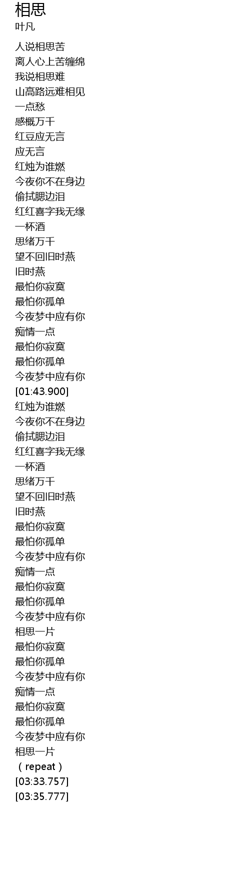 | [03:01.297] | xiāng sī yī piàn |