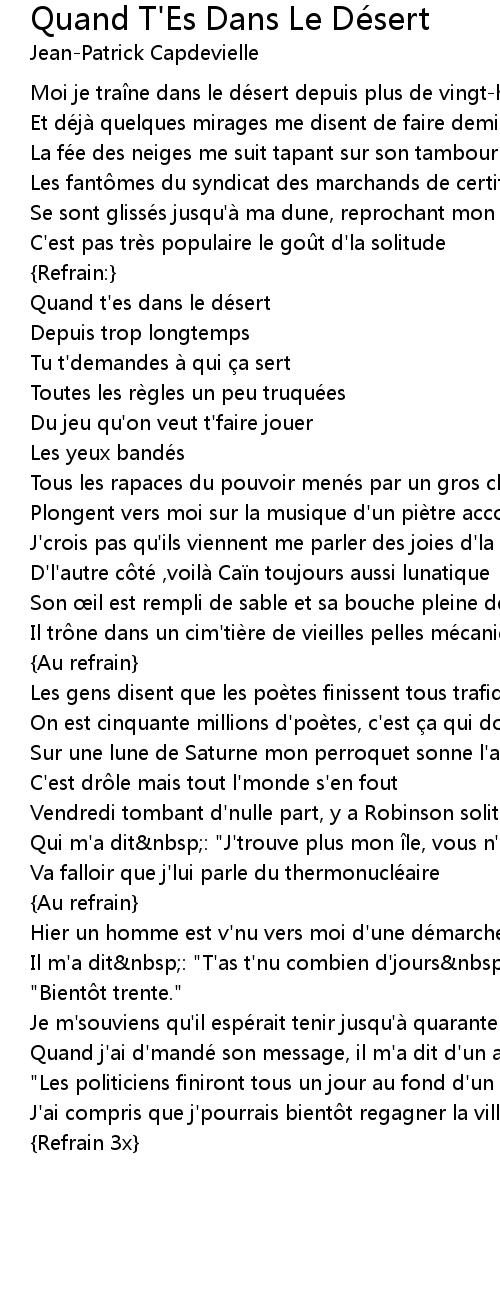 | Moi je tra ne dans le de sert depuis plus de vingthuit jours | |