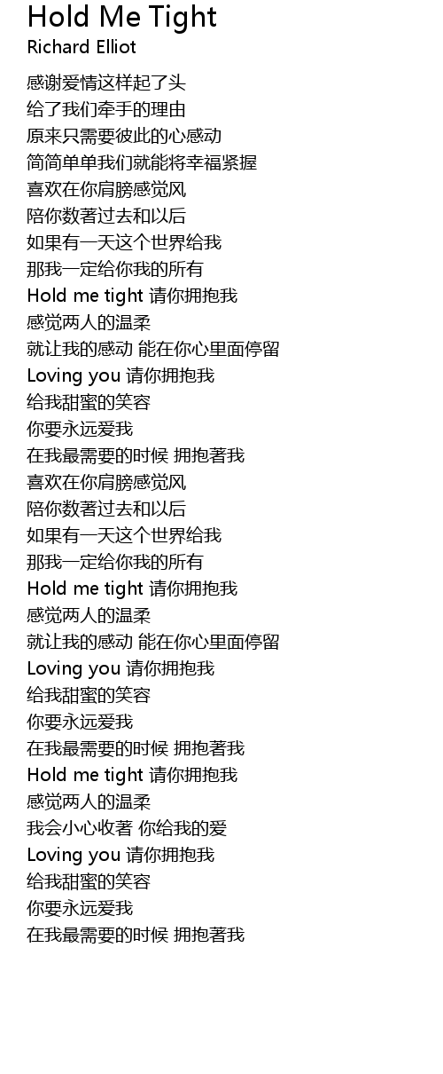 | [03:52.95] | Hold me tight qǐng nǐ yōng bào wǒ |