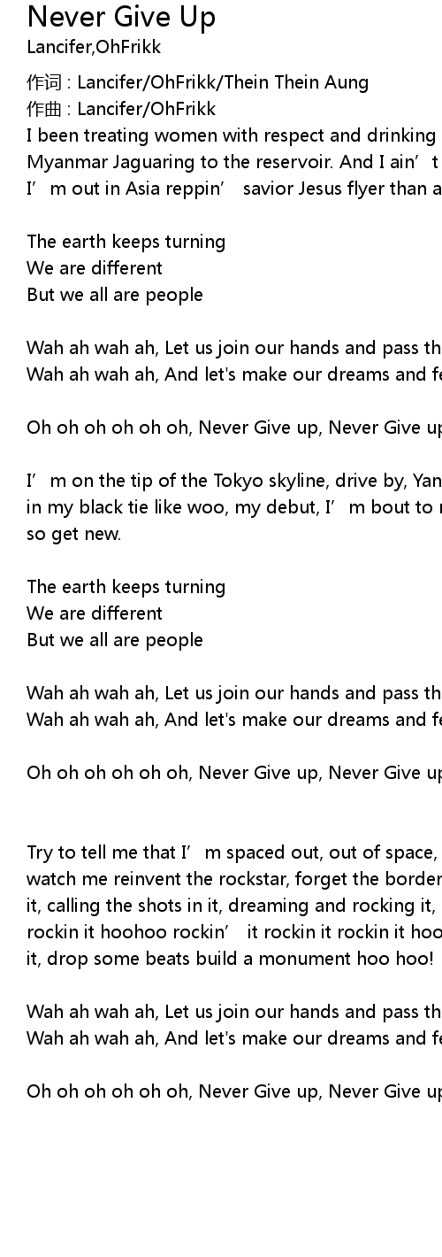 | Oh oh oh oh oh oh, Never Give up, Never Give up |