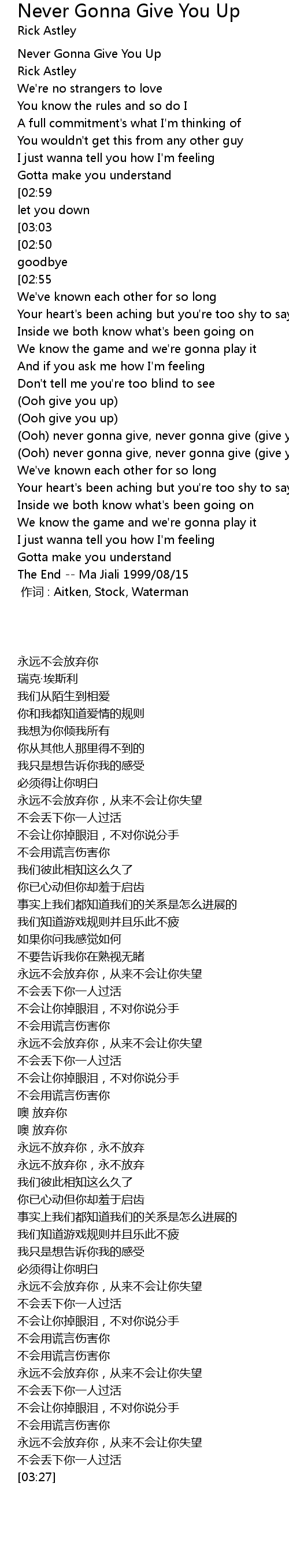 | [03:07][02:50][01:51][01:34][00:52] | Never gonna make you cry, never gonna say goodbye |