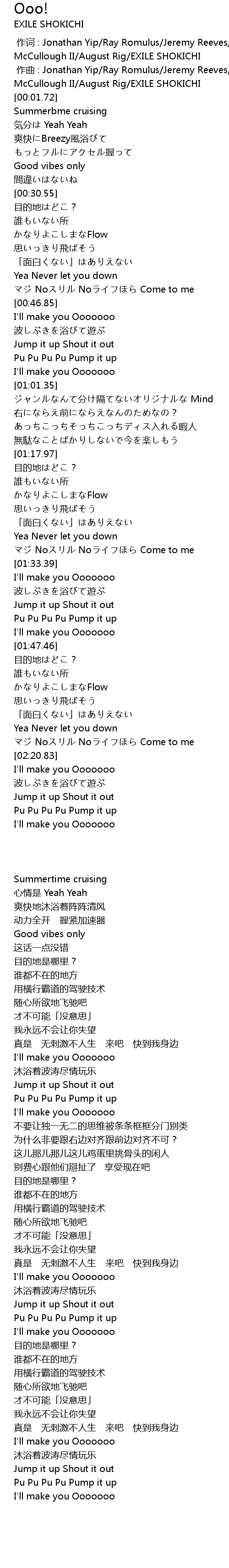 | [00:00.000] | 作词 : Jonathan Yip/Ray Romulus/Jeremy Reeves/Ray Charles McCullough II/August Rig/EXILE SHOKICHI |