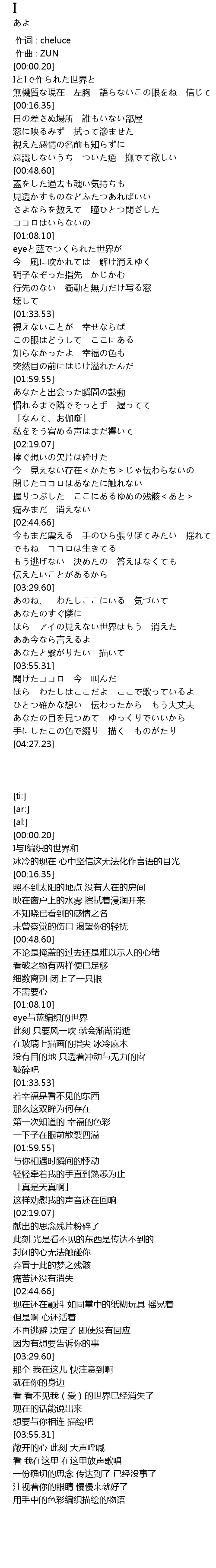 | [01:08.11] | eyeと藍でつくられた世界が |