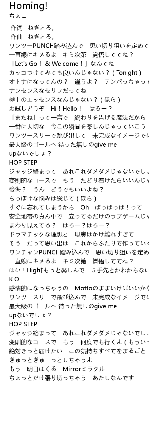 | [02:16.58] | はい!High↑もっと楽しんで 5手先とかわからない K.O |