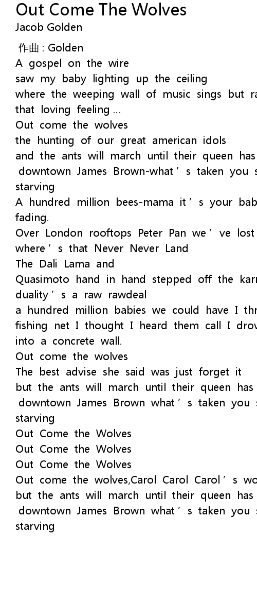 | [03:01.237] | Out come the wolves, Carol Carol Carol ' s words of wisdom |