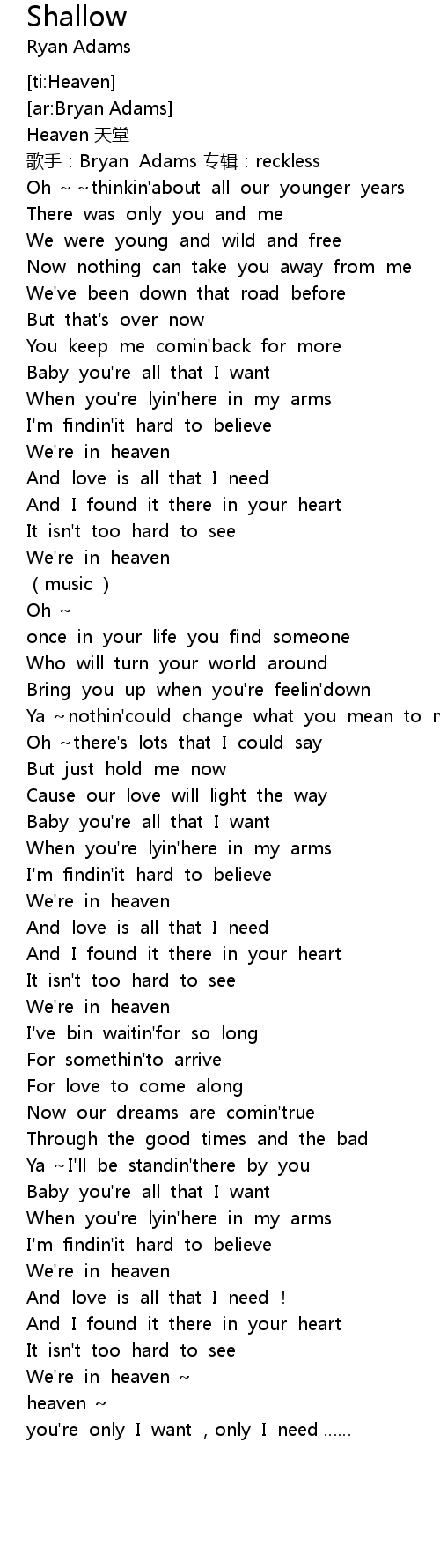 | [00:02.61] | 歌手:Bryan Adams 专辑:reckless |