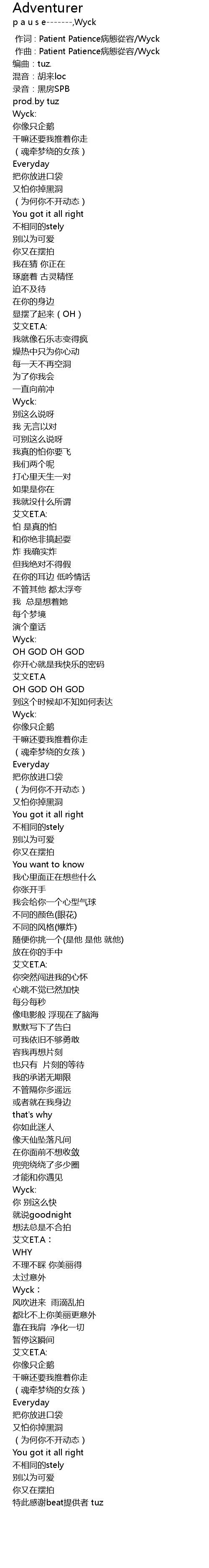 | [00:00.000] | 作词 : Patient Patience病態從容/Wyck |