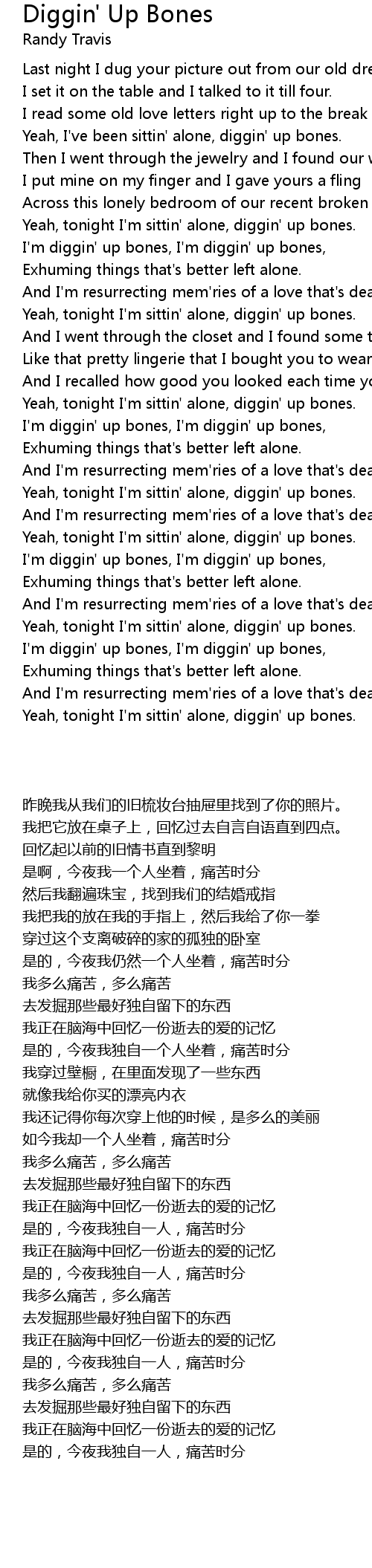 Yeah, tonight I'm sittin' alone, diggin' up bones. |