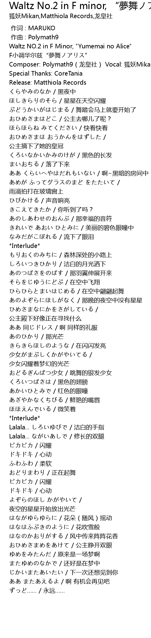| [00:00.000] | Waltz NO.2 in F Minor, "Yumemai no Alice" |