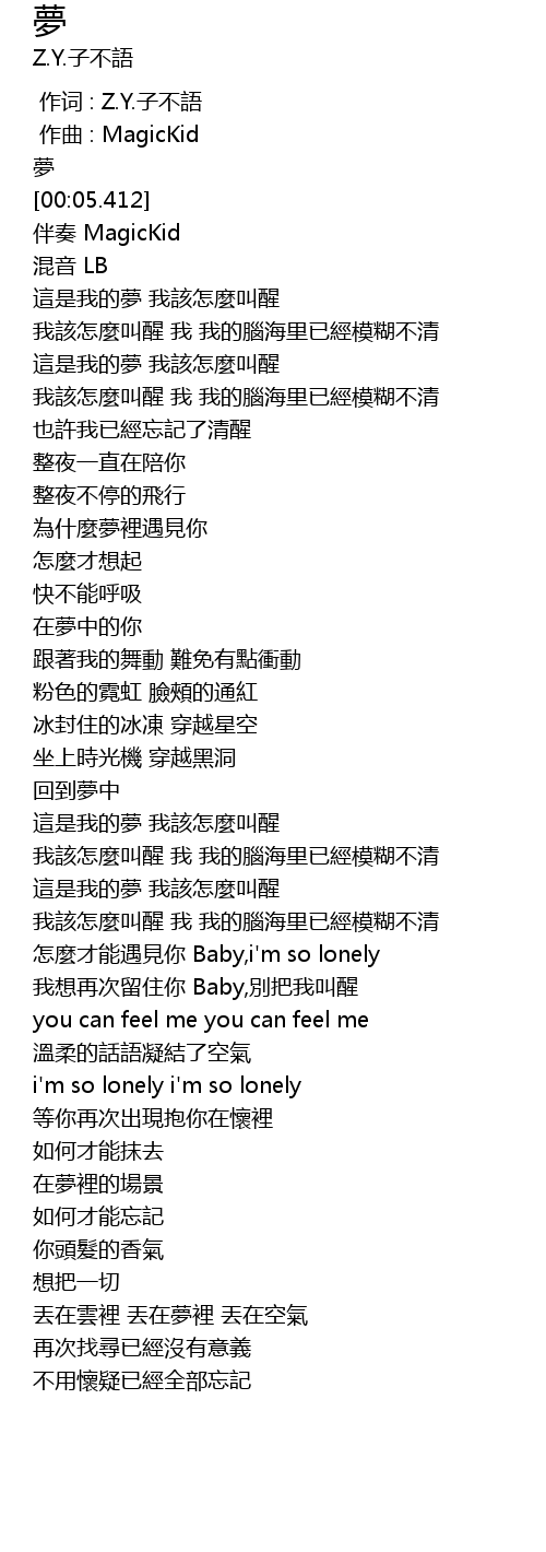 | [00:16.911] | 這是我的夢 我該怎麼叫醒 |
