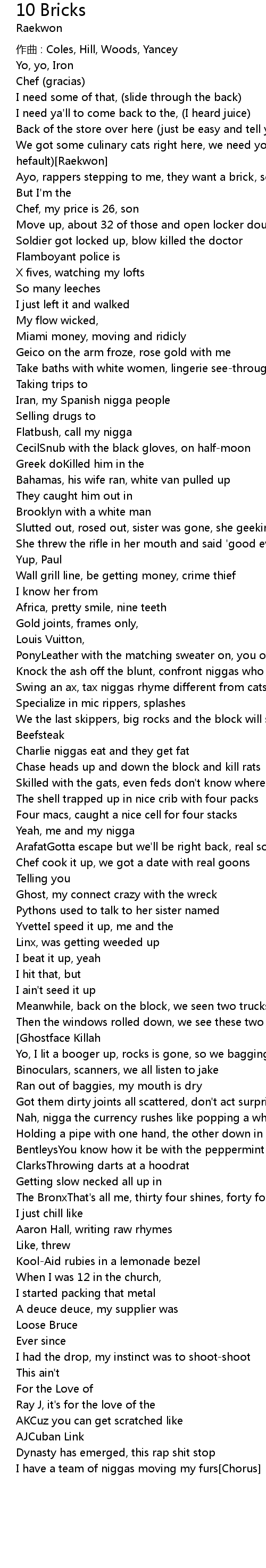 | PonyLeather with the matching sweater on, you owe me[Chorus: Raekwon] | |