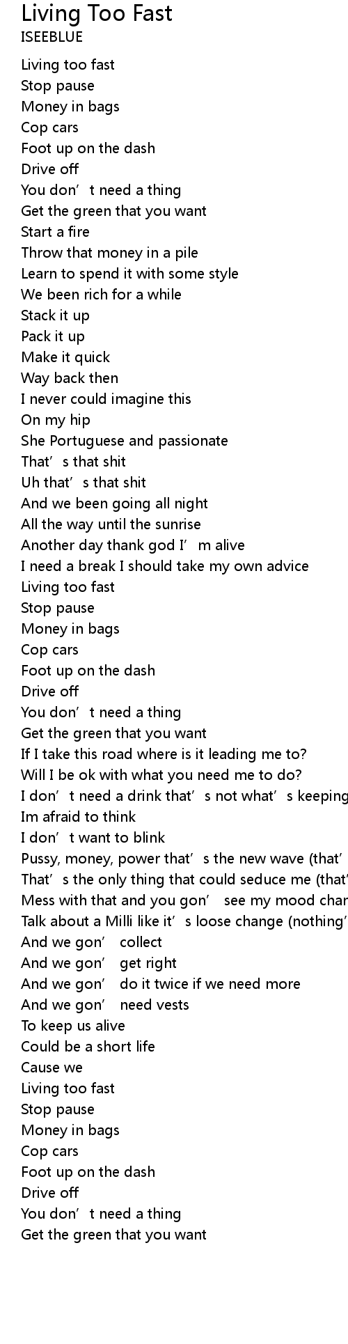 | [02:00.855] | Pussy, money, power that' s the new wave that' s that shit |