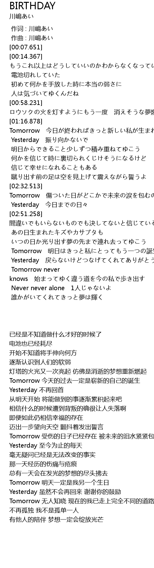 | [03:41.967] | Tomorrow 明日はきっと私にとってもう一つの誕生日 |