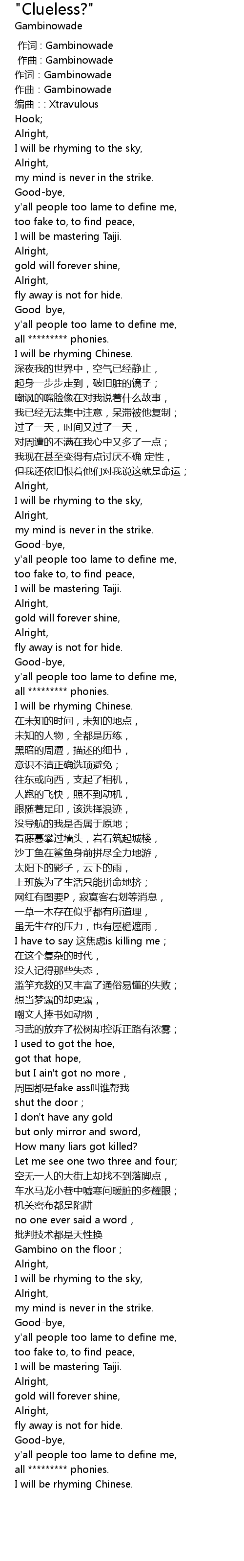 | [00:05.20] | 作词:Gambinowade |