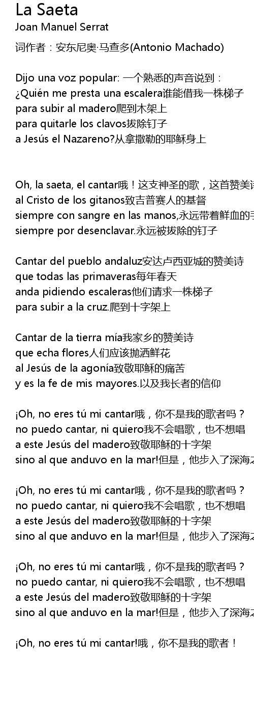 | [00:17.31] | Oh, la saeta, el cantar哦!这支神圣的歌,这首赞美诗 |