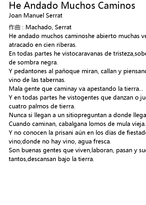 | He andado muchos caminoshe abierto muchas veredas;he navegado en cien maresy atracado en cien riberas. | |