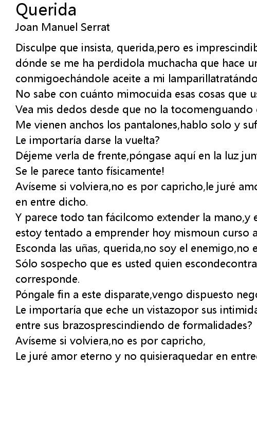 | Disculpe que insista, querida, pero es imprescindible su colaboració npara saber dó nde se me ha perdidola muchacha que hace un ratoestaba aquí conmigoechá ndole aceite a mi lamparillatratá ndome como a uno de la familia. | |
