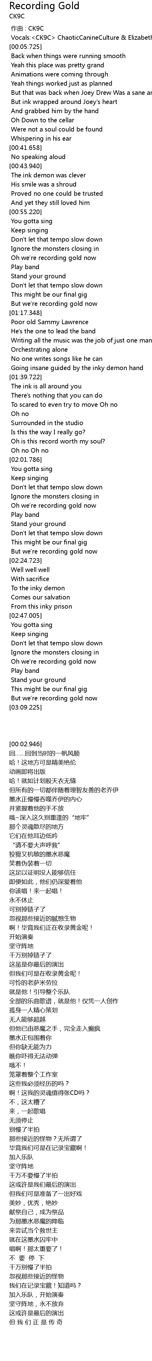 | [00:02.946] | Vocals: CK9C ChaoticCanineCulture Elizabeth Ann |