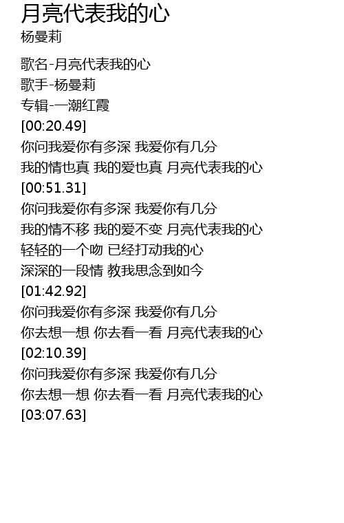 | [01:55.59] | 你去想一想 你去看一看 月亮代表我的心 |