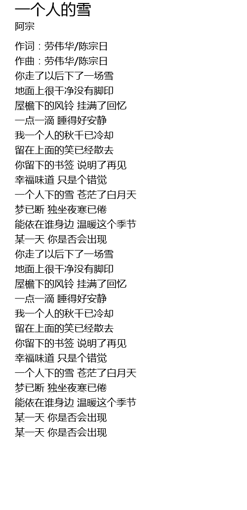 | [03:13.62] | 一个人下的雪 苍茫了白月天 |