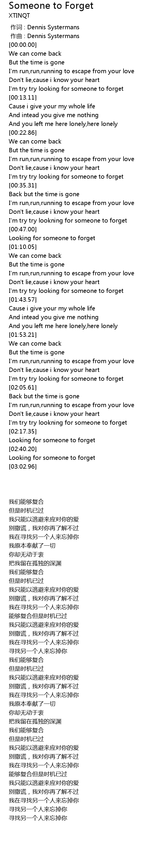 | [00:43.56] | I'm try try lookning for someone to forget |