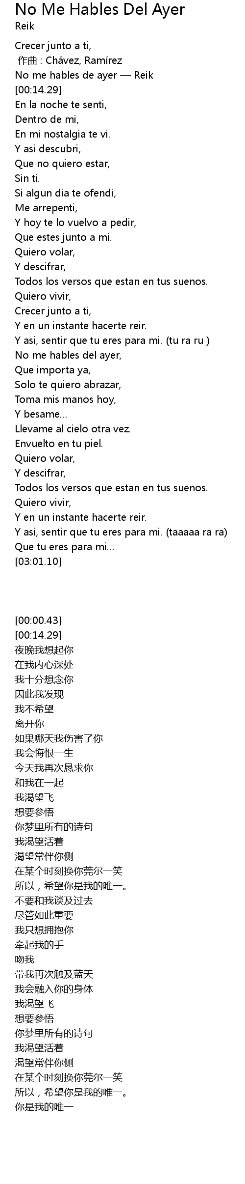 | [00:00.43] | No me hables de ayer — Reik |