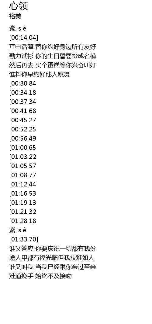 | [02:45.12][01:19.13] | zhǐ de dào xīn lǐng |