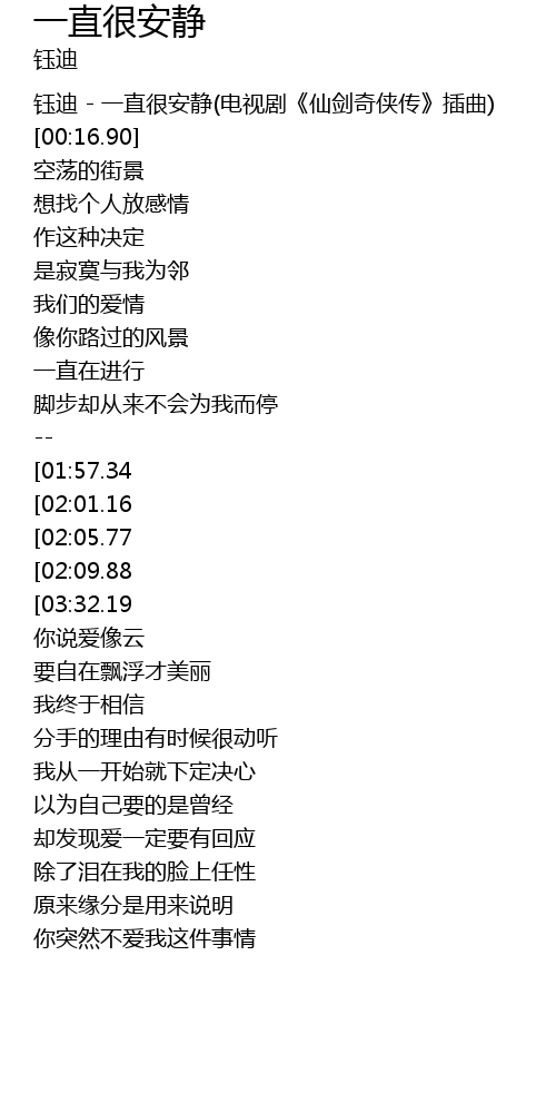 | [00:04.90] | 钰迪 - 一直很安静(电视剧《仙剑奇侠传》插曲) |