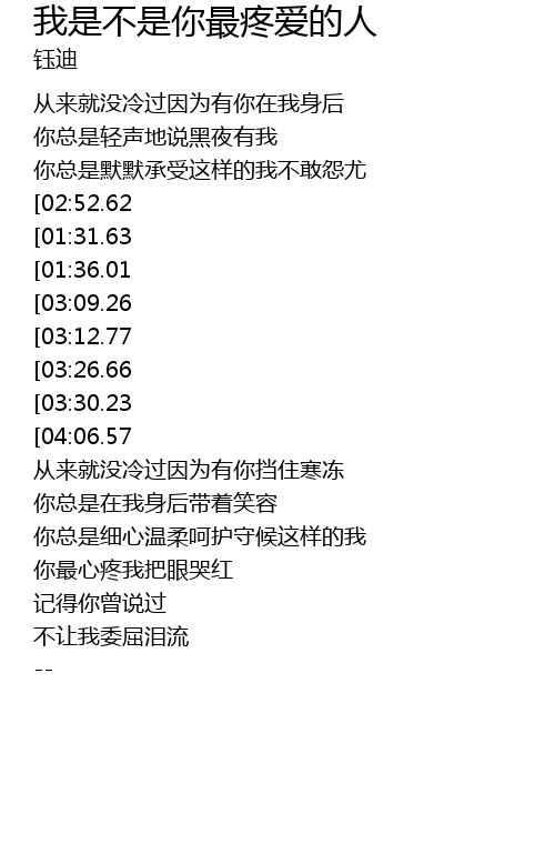 | [01:14.03][01:31.63][03:00.30][03:17.98][03:48.92] | 我是不是你最疼爱的人 |