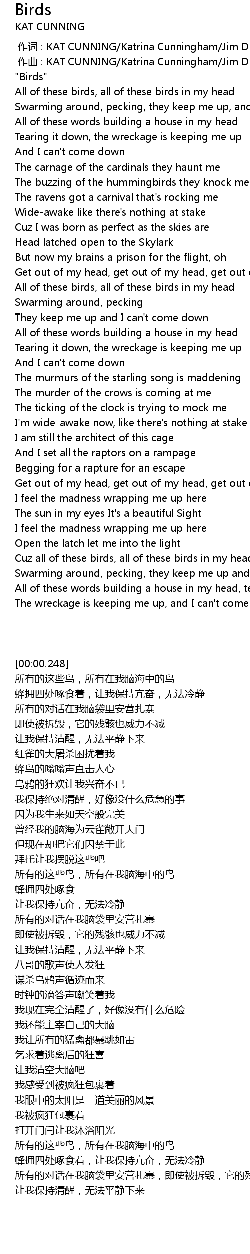 | [00:00.379] | All of these birds, all of these birds in my head |