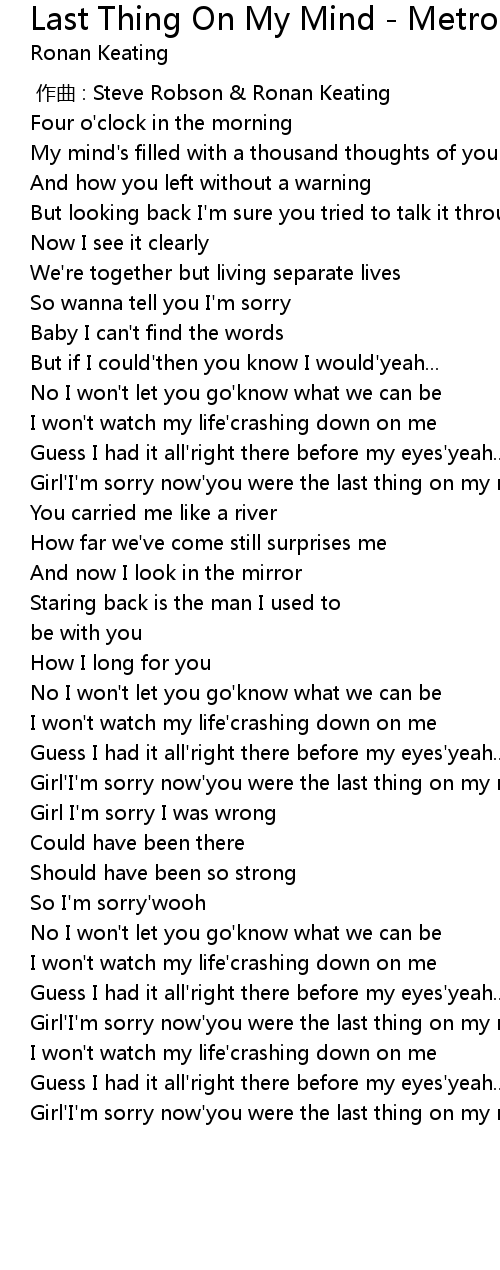 | [01:17.36] | Girl'I'm sorry now'you were the last thing on my mind |