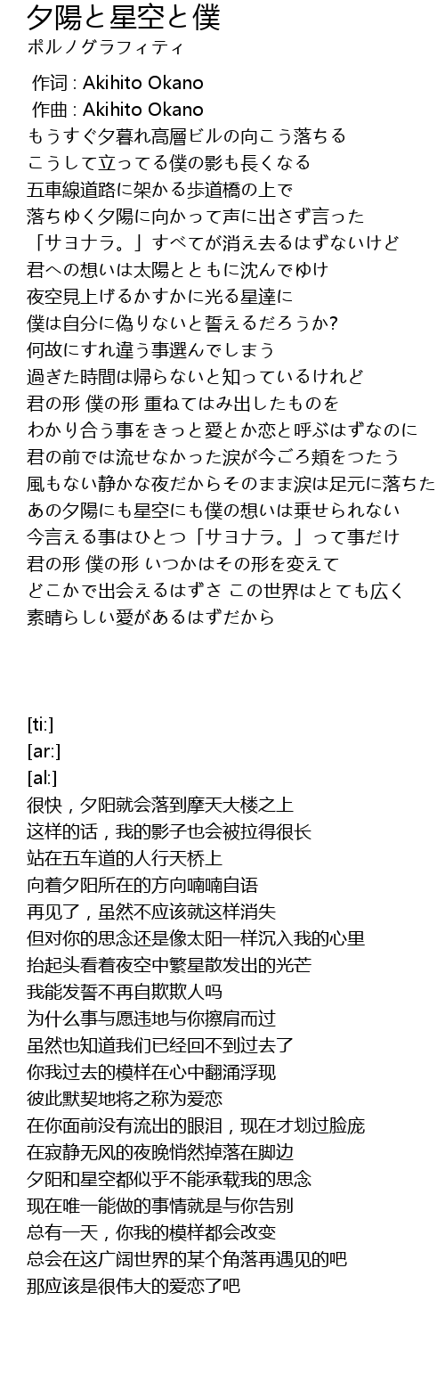 | [00:40.38] | 落ちゆく夕陽に向かって声に出さず言った |