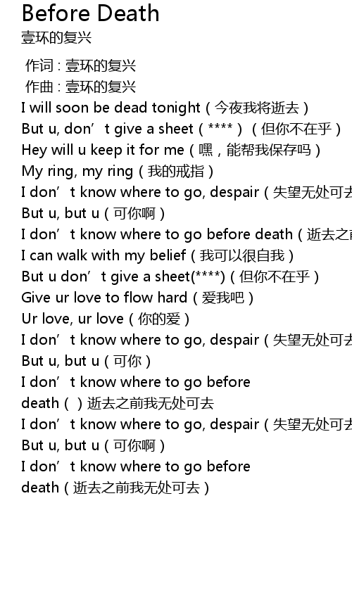 | [02:01.702] | I don' t know where to go before death shì qù zhī qián wǒ wú chǔ kě qù |