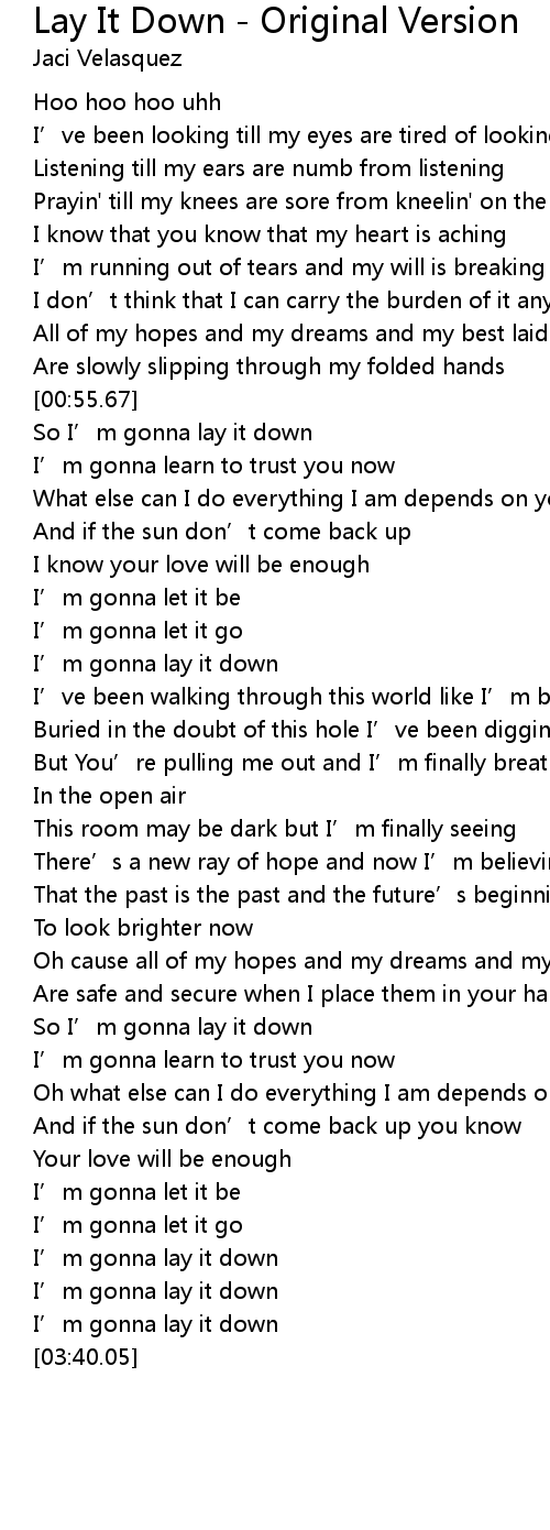 | [00:22.68] | Prayin' till my knees are sore from kneelin' on the bedroom floor |
