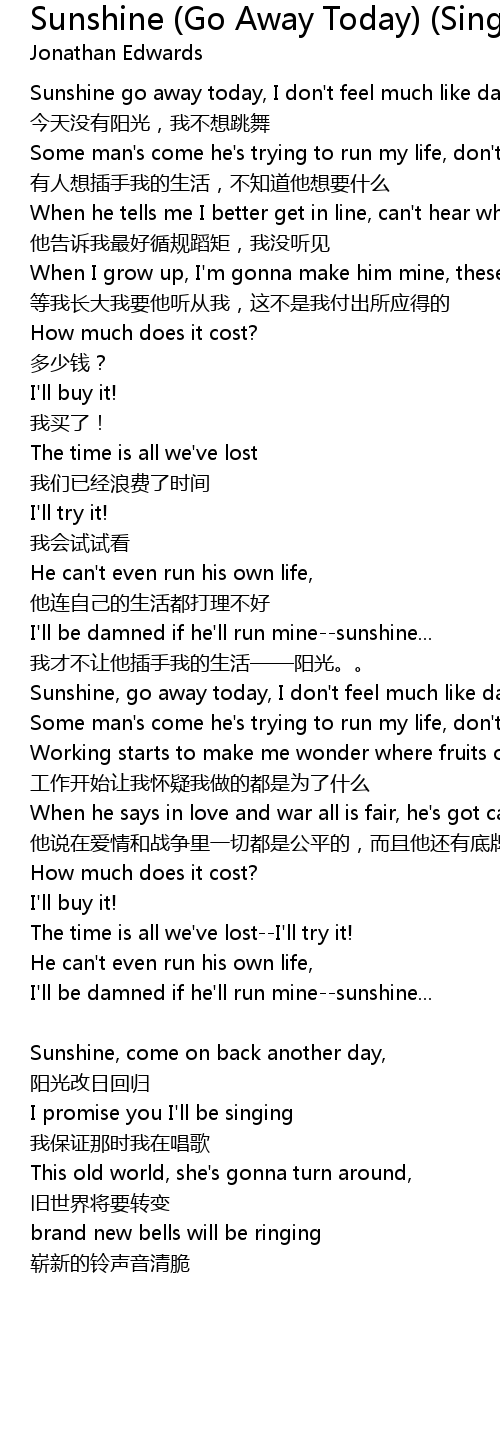 | Sunshine, go away today, I don't feel much like dancing | |
