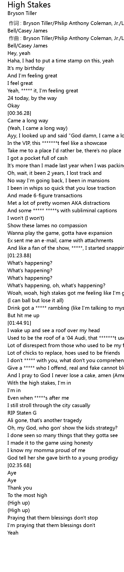 | [01:32.55] | Woah, woah, high stakes got me feeling like I' m gambling |
