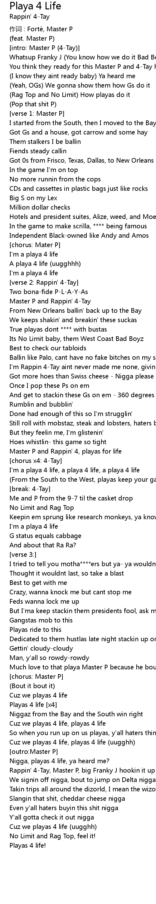 | Cuz we playas 4 life, playas 4 life | |