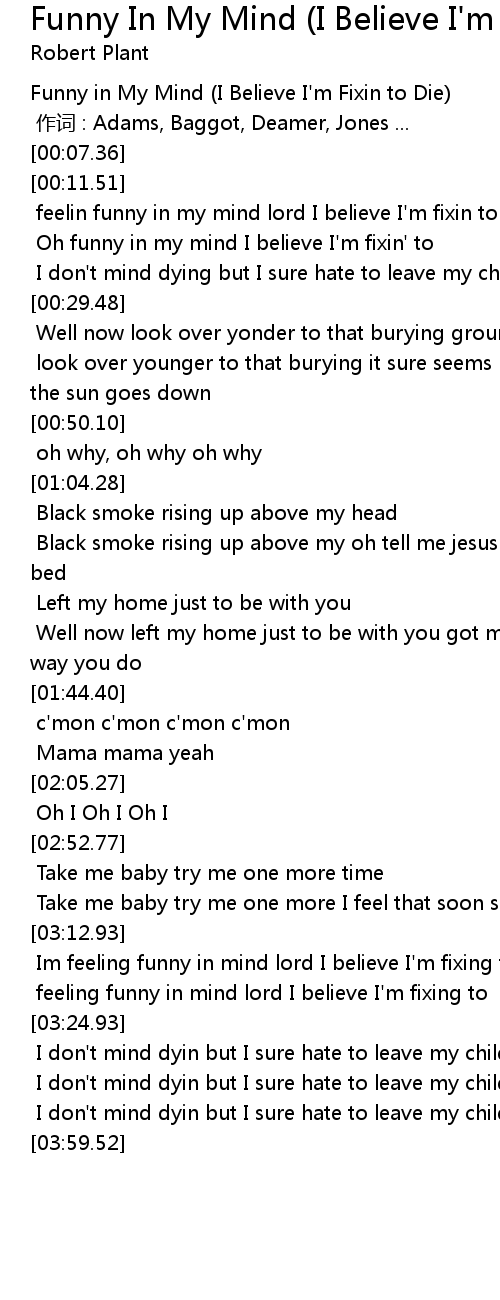 | [00:00] | Funny in My Mind I Believe I' m Fixin to Die |