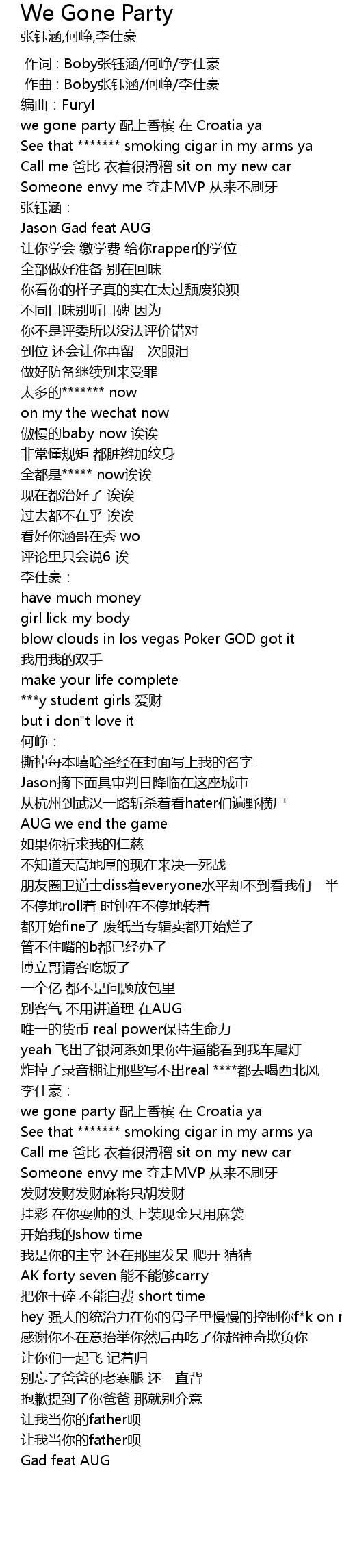 | [00:13.384] | we gone party pèi shàng xiāng bīn zài Croatia ya |
