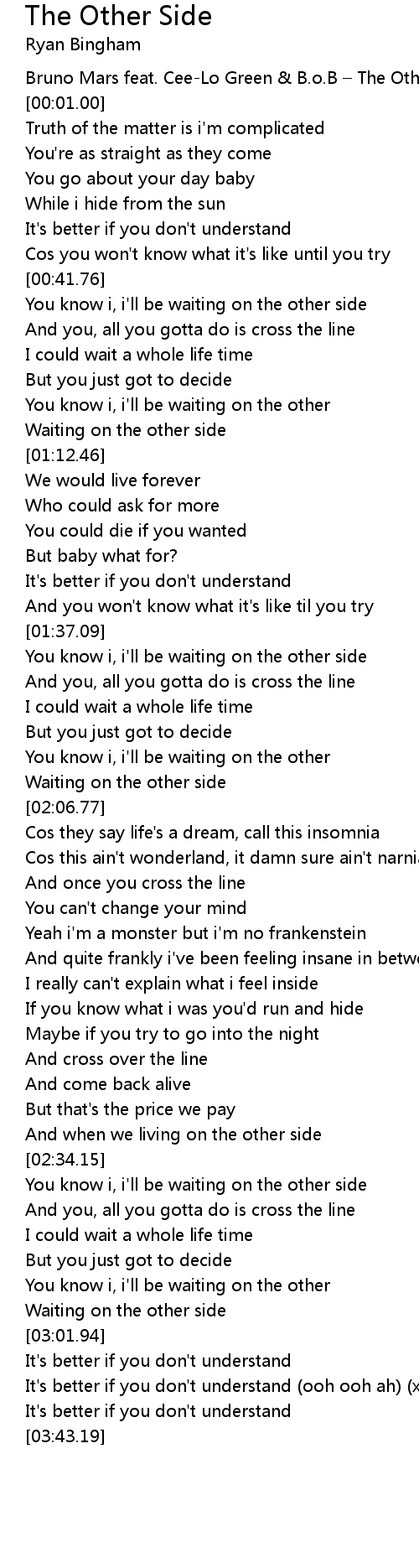 | [00:00.00] | Bruno Mars feat. Cee-Lo Green & B.o.B – The Other Side |