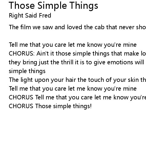 | CHORUS: Ain't it those simple things that make love a joy to live the pleasure they bring just the thrill it is to give emotions will sing with just those simple things | |