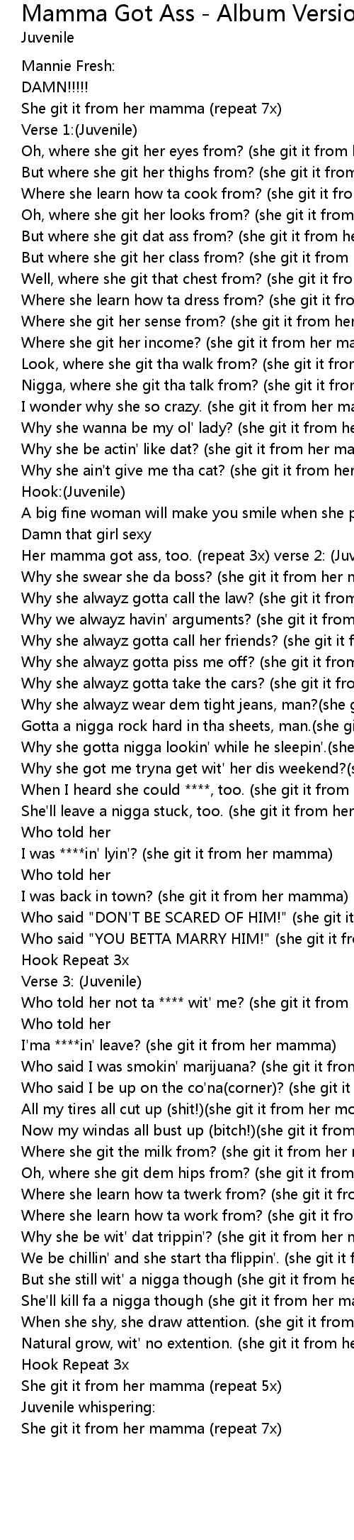 Her mamma got ass, too. (repeat 3x) verse 2: (Juvenile) |