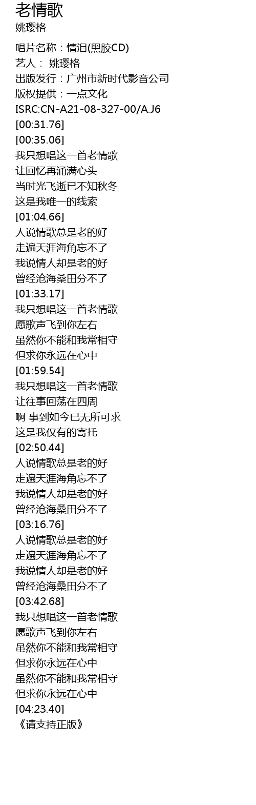 | [00:05.77] | 唱片名称:情泪(黑胶CD) |